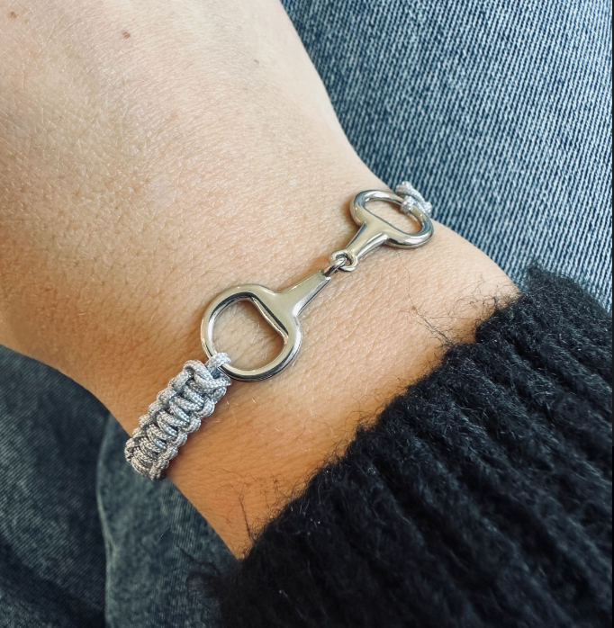 Met gevlochten nylon band, verkrijgbaar in de kleuren zwart, navy, grijs en roze. Keuze uit zilveren of gouden bitje, de sluiting is dezelfde kleur als het bit.