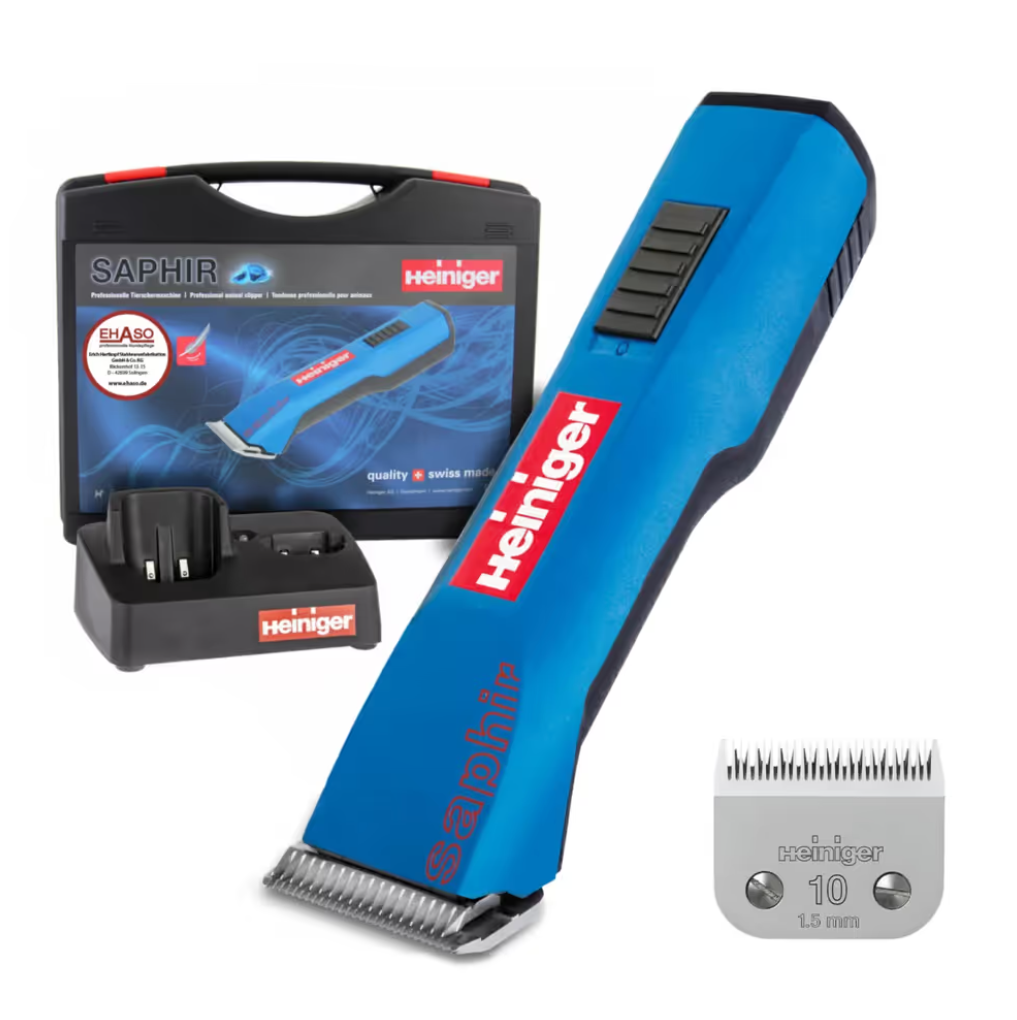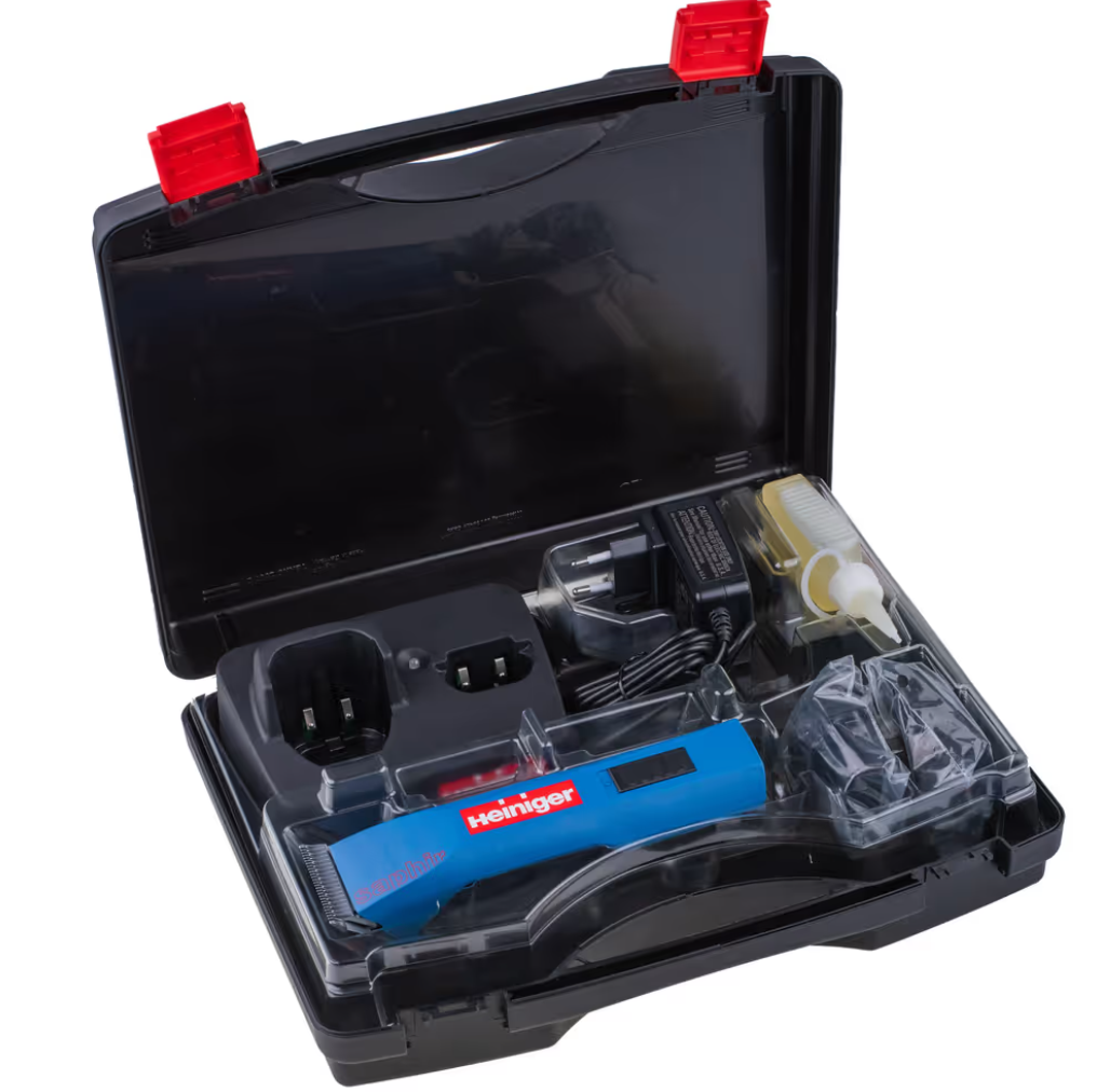 Heiniger Saphir, wordt geleverd met een oplaadbare batterij, een laadstation, het standaard Heiniger nr. 10 mes en de gebruikelijke onderhoudsmiddelen voor het product.