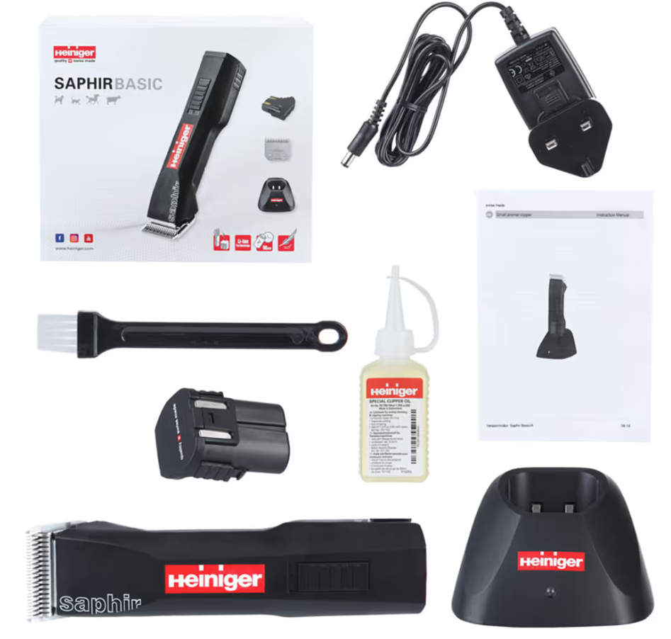 De Heiniger Saphir Basic wordt geleverd inclusief nr. 10 scheerkop, laadstation, 1 Lithium-Ionen accu, olie, reinigingsborstel en handleiding. Bevat een hoogwaardig laadstation voor het opladen van accu’s en een batterij indicator. Exclusief koffer.